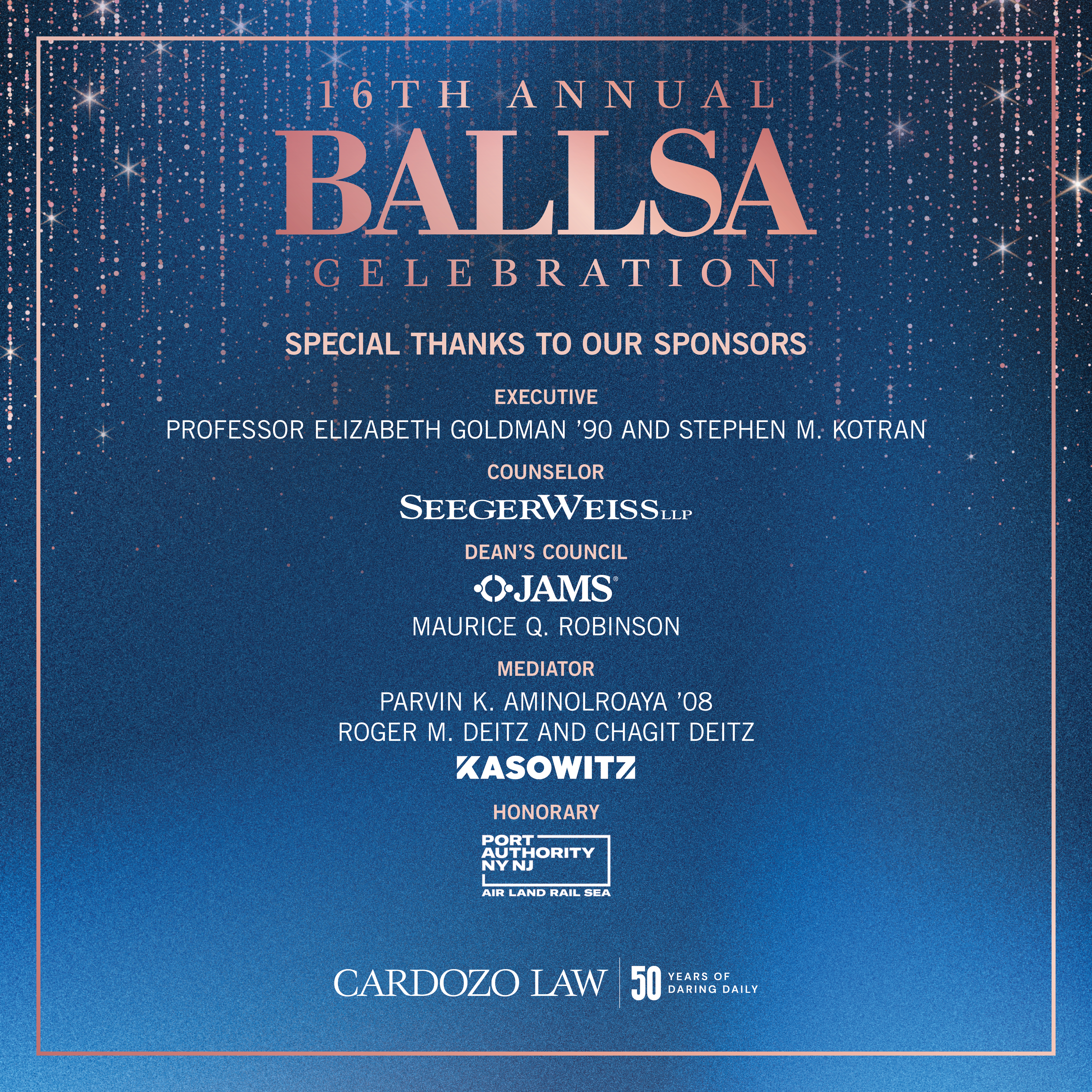 The Annual BALLSA Alumni Celebration recognizes the achievements and contributions of Cardozo's outstanding diverse community. Since 2008, this signature event has become one of the school's most anticipated annual gatherings, bringing together the law school's alumni, students, faculty, and friends. The event highlights the accomplishments and successes of Cardozo alumni and demonstrates what is achievable for younger professionals and students alike. All contributions to the BALLSA Celebration support the BALLSA Scholarship Fund.