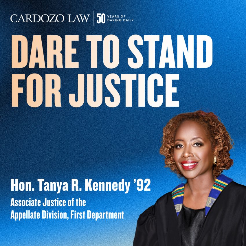 Tanya R. Kennedy dares to stand for justice through her long and distinguished career on the bench, from Criminal and Civil Courts to her current role as Associate Justice of the Appellate Division, First Department. A proud Cardozo alumna, adjunct educator, and leader in the legal community, Justice Kennedy’s commitment to fairness, mentorship, and the rule of law reflects the very best of what it means to stand for justice. Thank you for your service on the Cardozo Board and for championing excellence in our community!