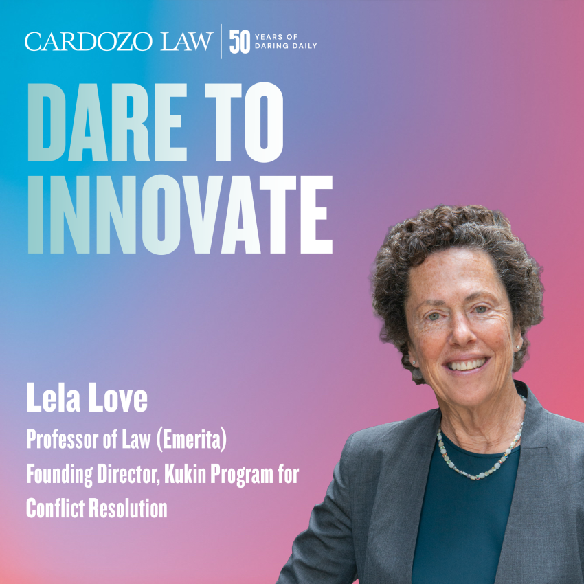 Professor (Emerita) Lela Love, dared to reimagine how lawyers resolve conflict. A renowned mediator and dispute resolution pioneer, Professor Love joined Cardozo in 1985 and founded the Cardozo Mediation Clinic—one of the nation’s first programs to train law students as mediators. In 1990, she established the Kukin Program through a generous gift from Ira and Doris Kukin. Today, the Kukin Program includes four clinical offerings, the Cardozo Journal of Conflict Resolution, the International Advocate for Peace Award, and a comprehensive dispute resolution curriculum. Cardozo is now ranked the fifth-best dispute resolution law program in the country by U.S. News—a lasting testament to her vision.