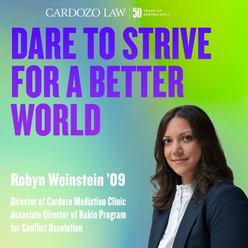 Cardozo alumna Robyn Weinstein ‘09 dares to strive for a better world through her leadership in alternative dispute resolution. As Director of the Cardozo Mediation Clinic and Associate Director of the Kukin Program for Conflict Resolution, Robyn brings a deep commitment to equity and access to her work training the next generation of mediators. From her prior service as ADR Administrator for the U.S. District Court for the Eastern District of New York—where she launched innovative, inclusive mediation programs—to her national leadership in the field, her career reflects the power of dispute resolution to strengthen communities and advance justice.