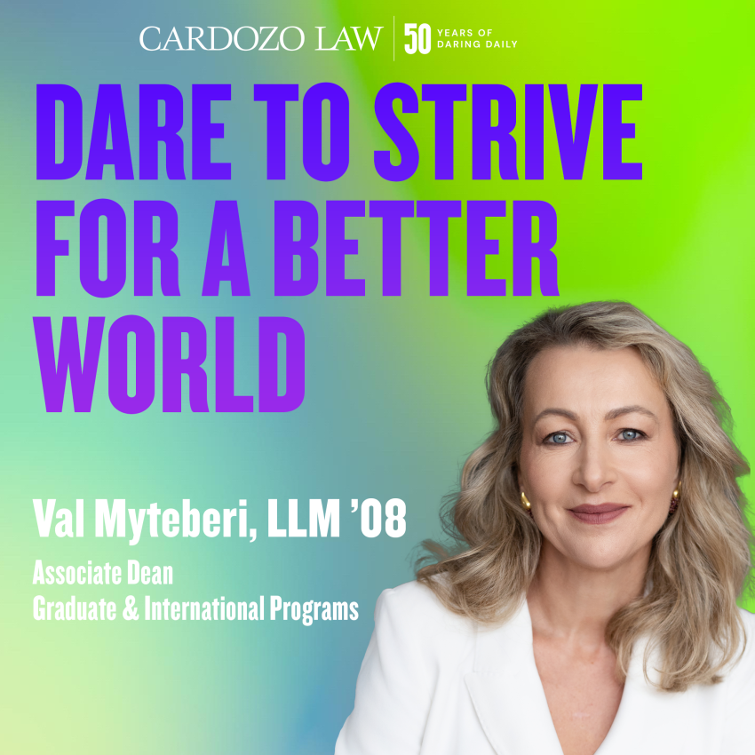 Valbona Myteberi dares to strive for a better world by building bridges between Cardozo and the global community. As Associate Dean of Graduate and International Programs, she plays a central role in expanding international partnerships, supporting students from around the world, and shaping innovative programs that prepare lawyers for a globalized legal landscape. Through her leadership, Cardozo continues to connect ideas, people, and opportunities across borders, strengthening a vibrant, worldwide legal community and creating pathways for impact far beyond the classroom.